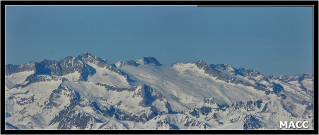 I el sector central del Pirineu, amb el sector de Las Maladetas al mig, a l'esquerra el sector dels Besiberris, i a la dreta el sector del Perdiguero, a més, segons el programa PeakFinder, entre els sectors del Perdiguero i Las Maladetas, al fons, es veuen unes puntes, que són els cims del sector del Monte Perdido, però bé, la realitat és que és molt difícil reconèixer res.