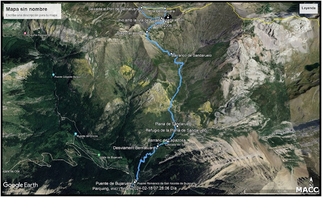 El camí és fàcil de seguir, ben marcat i fressat, i de moment sense neu, creuem el torrent de Lapazosa per un petit pont, passem pel refugi lliure de la Plana de Sandaruelo i anem pujant seguint un fresat corriol.